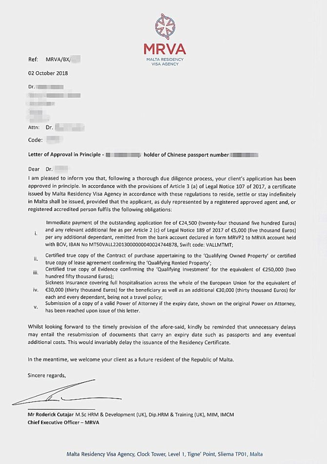 S先生提交给律师的材料在经过2-3天的初审之后被提交给了马耳他身份局。因前期S先生提供的材料非常全面且正规,完全符合身份局的要求,因此不到四个月的时间,身份局便完成了对S先生的尽职调查,并下发了原则性获批函。S先生也对马耳他身份局的工作效率非常认可,表示MRVP项目申请速度非常快,会推荐更多的朋友来申请项目。