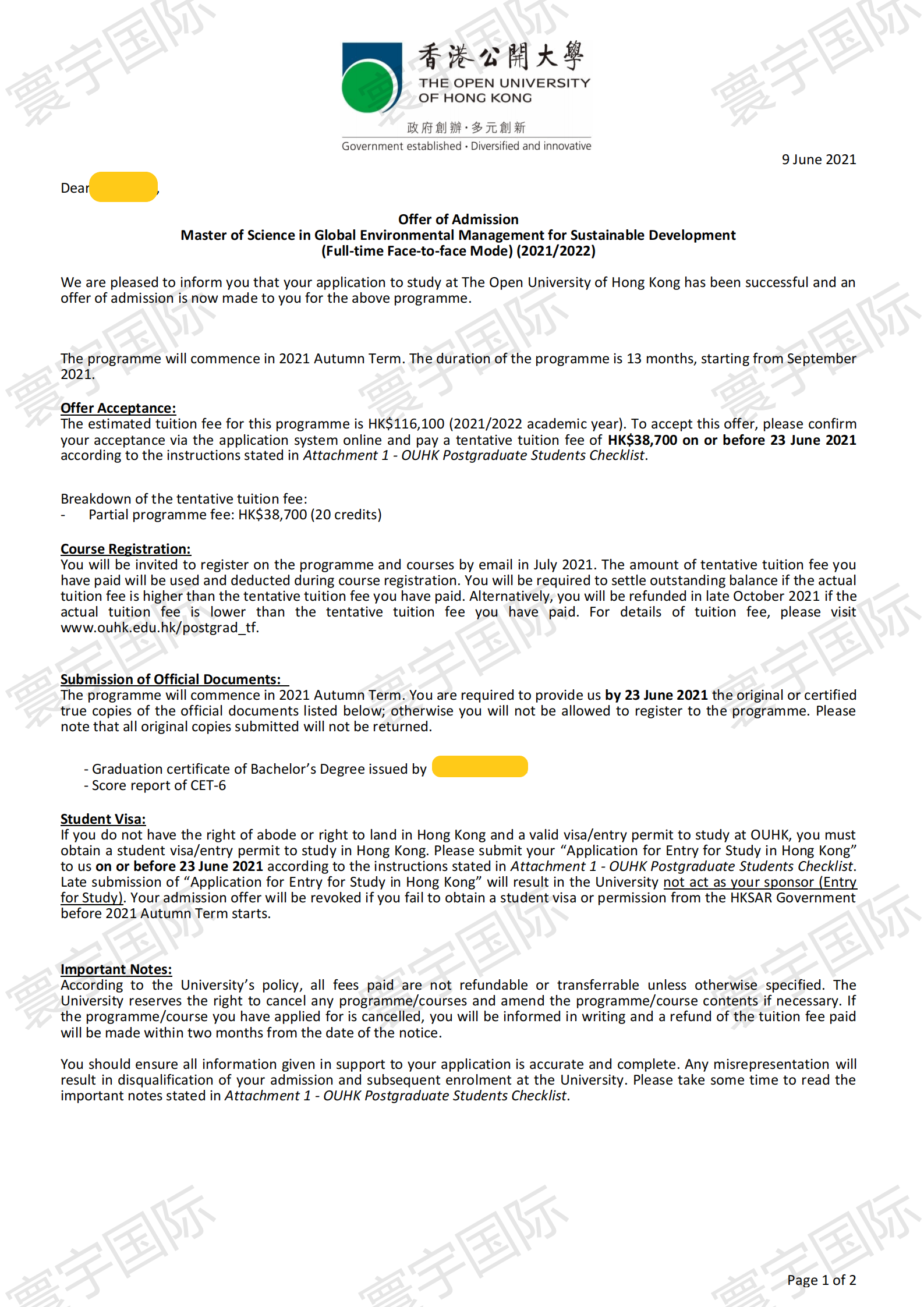【香港留学移民】恭喜C女士获得香港公开大学硕士录取通知