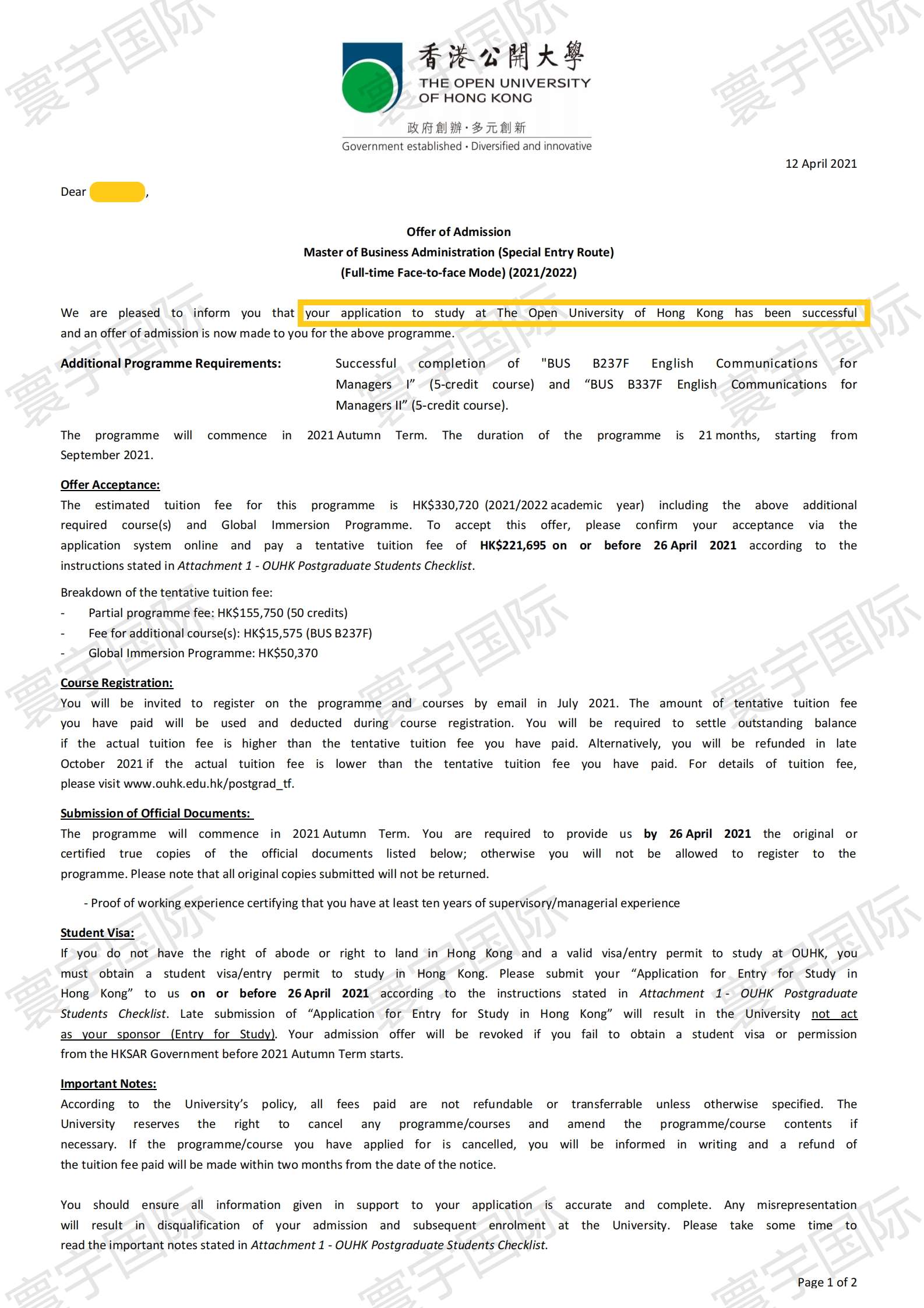 【香港留学移民】恭喜N先生获得香港公开大学硕士录取通知