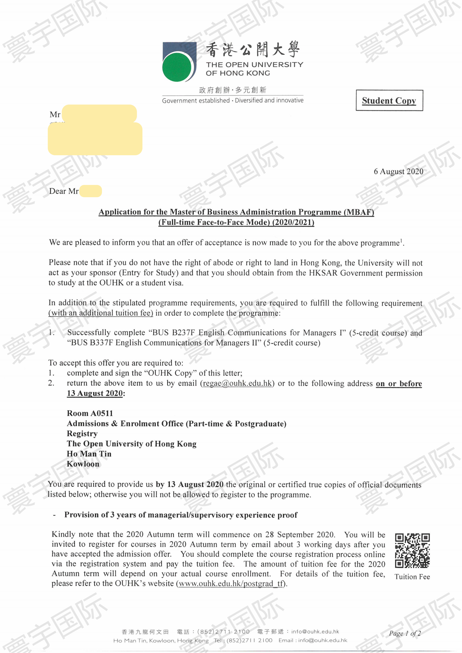 【香港留学移民】恭喜L先生获得香港公开大学硕士录取通知